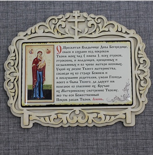 “О Дева Мария Пресвятая Богородица, защити и окутай Своим покровом моих детей (имена), всех детей в нашем роду, подростков, младенцев, крещенных и неназванных, носимых в утробе матери. Покрой их ризою Твоей материнской любви, научи их страху Божьему и послушанию своим родителям, попроси Господа, Твоего Сына о даровании спасения им. Я полностью полагаюсь на Твое Материнское смотрение, поскольку Ты есть Божественная Покрова всех раб Твоих.