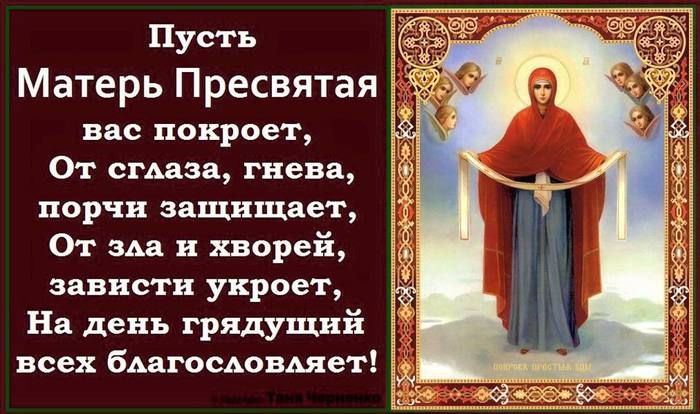 «Пресвятая Богородице, прими молитвы сии с великой надеждой и верой на Твое безмерное милосердие возносимые, помилуй, заступи, спаси, сохрани и защити мя, рабу (раба) Божью (его) (имя), от всякого зла и покрый мя и мою семью (дом) честным твоим Молитвенным Покровом от всякой беды, напасти и колдовства в год сей». (Далее можно добавить искренние просьбы: о замужестве, детях, защите, удаче в делах и т.д.)
