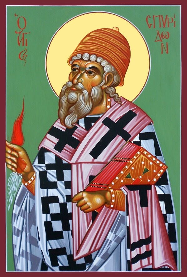 Равноангельна Спиридона зрим, великаго чудотворца. Некогда страна от бездожия и засухи вельми пострада: бысть глад и язва, и многое множество людей умроша, молитвами же святителя сниде с небесе на землю дождь; людие же, избавльшеся от бедствия, благодарственно взываху: