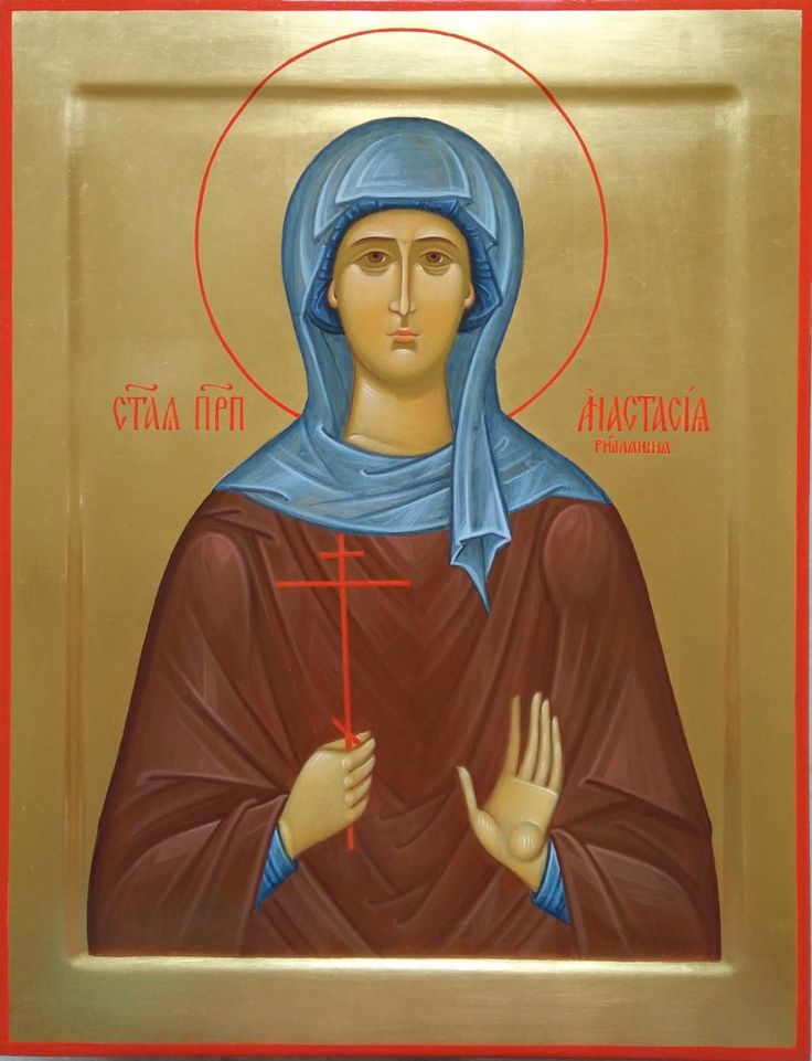 Преподобномученица Анастасия Римлянка родилась в Риме от знатных родителей и в трехлетнем возрасте осталась сиротой. Будучи сиротой, она была взята в женский монастырь под Римом, где настоятельницей была некая София, монахиня высокого уровня совершенства. Она воспитала Анастасию в горячей вере, в страхе Божием и послушании. Через семнадцать лет Анастасия была известна христианам как великая подвижница, а язычникам — как редкостная красавица.