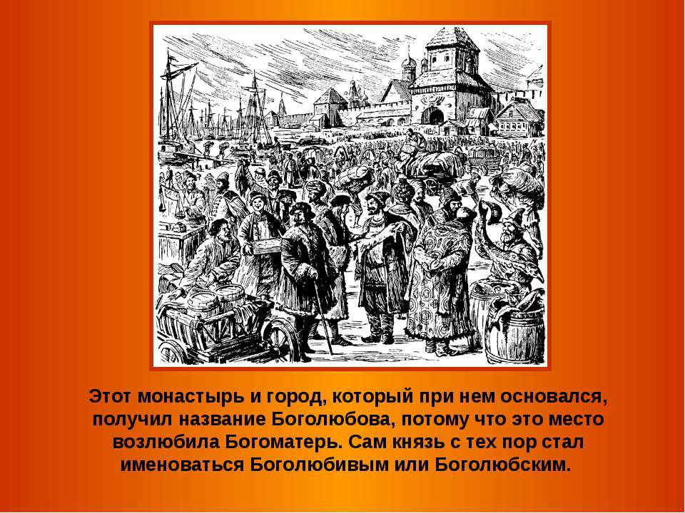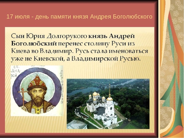 Князь Андрей Боголюбский (прозвище «Боголюбский» получил как основатель города Боголюбый на реке Нерли) является одним из самых видных политических деятелей Древней Руси. Во времена княжения Андрея Боголюбского политический и экономический центр Руси переместился из Киева и Киевского княжества в город Владимир, который позднее официально стал новой столицей. Благодаря деятельности князя Андрея город Владимир и Владимирское княжество начали активно развиваться экономически и достигли небывалого до этого могущества.
