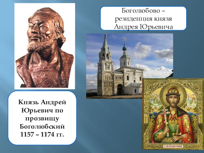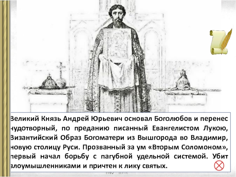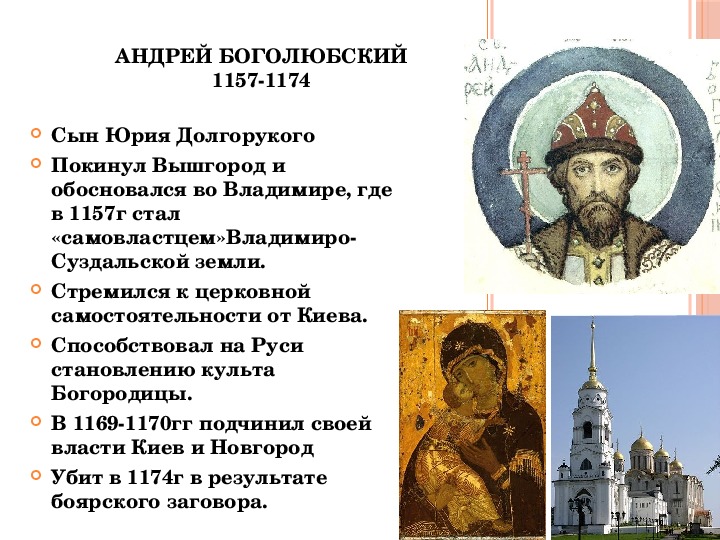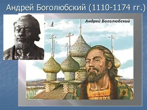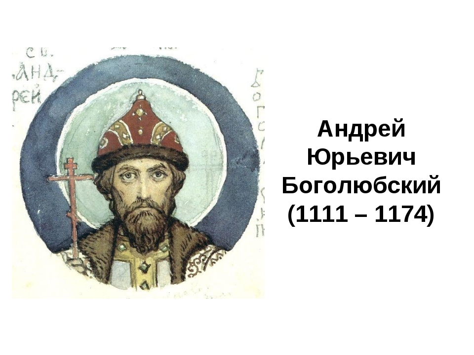 Андрей Боголюбский – князь Вышгородский, Дорогобужский, Рязанский и Владимирский. Является сыном Юрия Долгорукого. При правлении Петра 1 Боголюбский был канонизирован Русской православной церковью.