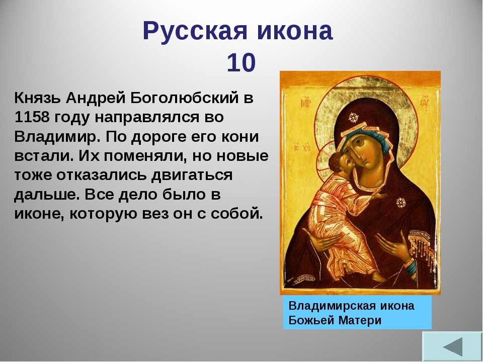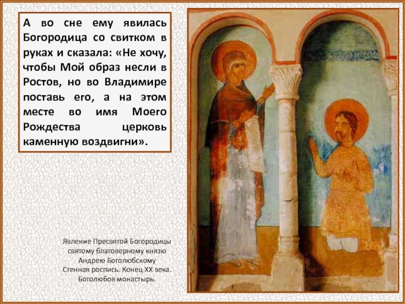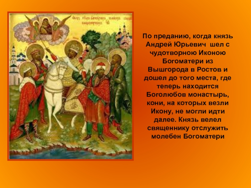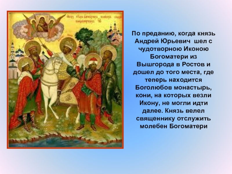 По преданию, Андрей Боголюбский якобы увидел сон, где ему было сказано оставить икону во Владимире, что он и сделал. Кроме этого, на месте, где ему приснился сон, князь образовал поселение Боголюбово.