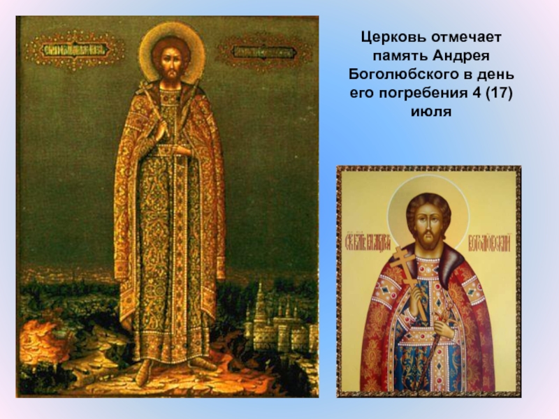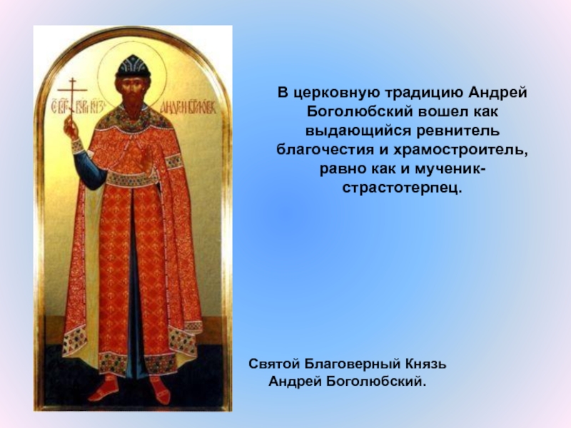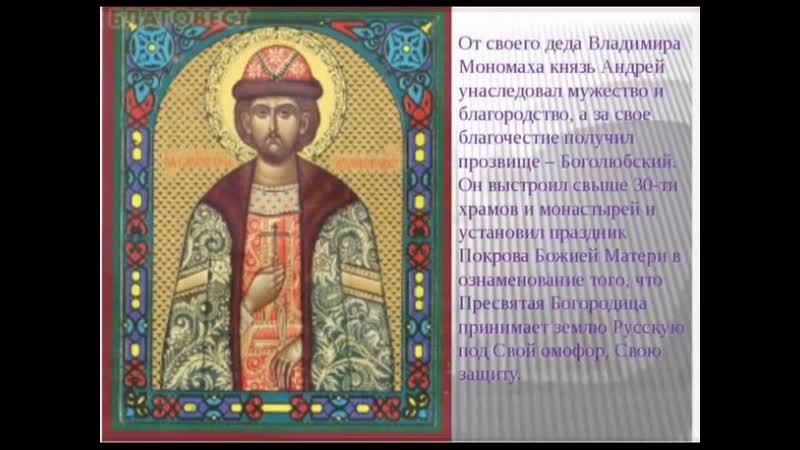 Святой Благоверный князь Андрей Боголюбский (предположительно 1111 — 1174 гг.) – князь Вышгородский, Дорогобужский, великий князь Владимирский; сын Юрия Долгорукого, внук Владимира Мономаха.