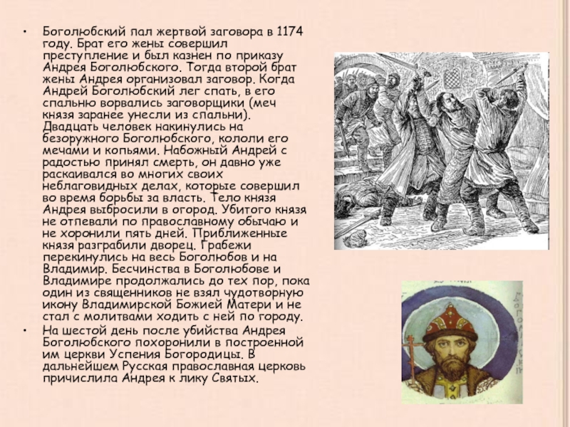 Но злодеи нашли его по кровавому следу, после чего нанесли ему смертельные удары. Труп Боголюбского лежал во дворе, а тем временем народ мародерствовал в его покоях.