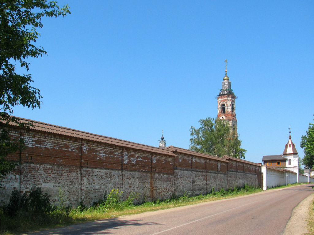 востоку и, в связи с этим, перестроена монастырская ограда. За территорией монастыря, к северо-востоку от него, к концу XIX века было построено множество принадлежавших ему построек. Среди них выделяются комплексы гостиницы для богомольце, монастырского училища, конного и скотного дворов. Кроме того, здесь находились часовня, рига и молотилка, кузница, сторожка, лавка, на берегу реки — мельница, баня, водоподъемная машина.