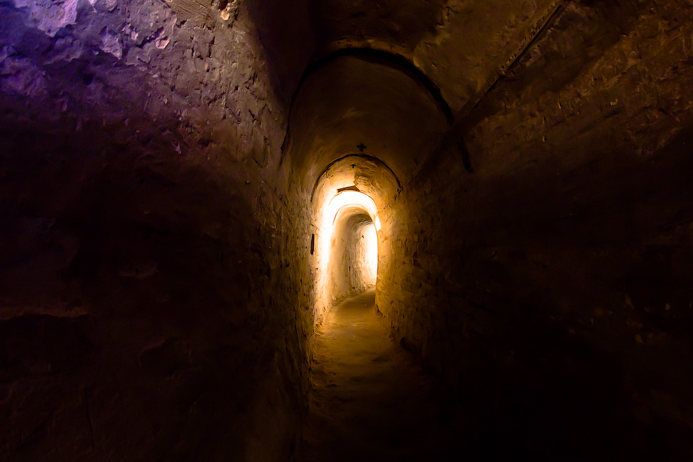 Зажигаю свечку – спускаюсь вниз по узким каменным долгим ступенькам. Вот и развилка дорог – налево «экскурсантам», направо – паломникам. Ничего страшного здесь нет. Узкие коридоры, их высота и форма сводов – тщательно продуманы – они пропорциональны размерам человеческой фигуры. Стены белые, отштукатуренные. Воздух свежий, никакой «спёртости» или его недостатка не ощущается.