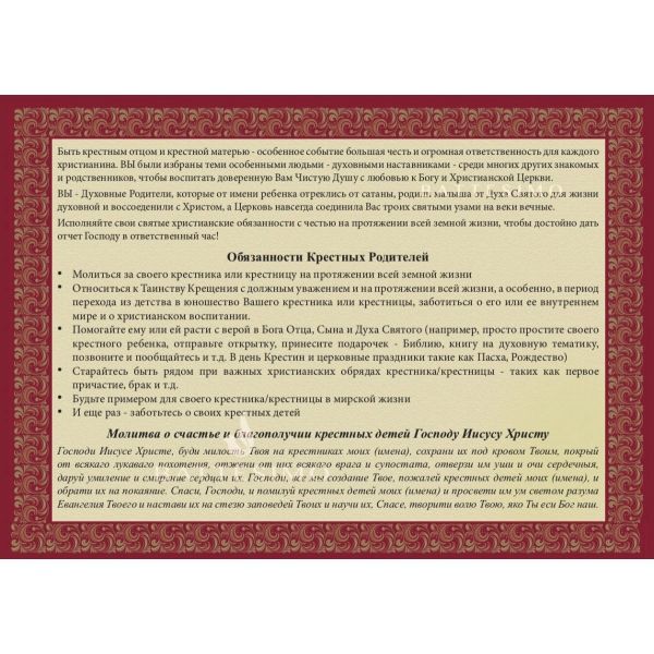 Главное, в чем может и должен помочь крестный и в чем он берет на себя обязательство, — это не в том только, чтобы присутствовать на Крещении, но и потом помочь воспринятому от купели возрастать, укрепляться в церковной жизни, и ни в коем случае не ограничить свое христианство только фактом Крещения. По учению Церкви, за то, как мы позаботились об исполнении этих своих обязанностей, с нас так же спросится в день последнего суда, как и за воспитание наших собственных детей. Поэтому, конечно, ответственность очень и очень большая.