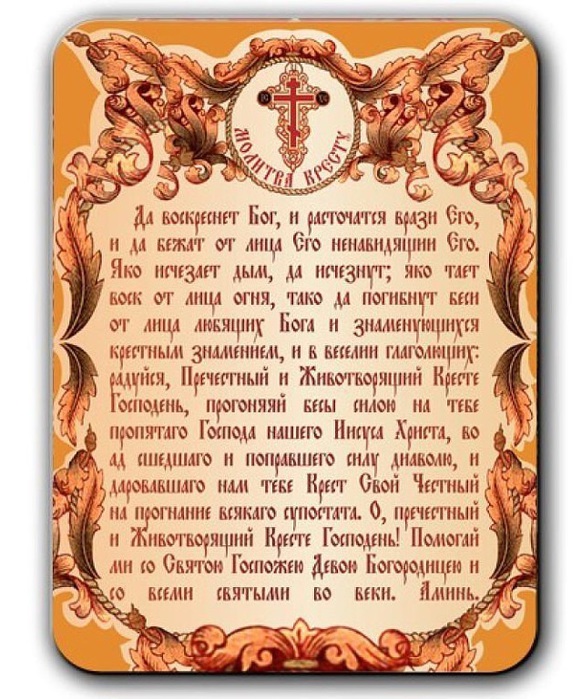 Яко исчезает дым, да исчезнут; яко тает воск от лица огня, тако да погибнут беси от лица любящих Бога и знаменующихся крестным знамением, и в веселии глаголющих: радуйся, Пречестный и Животворящий Кресте Господень, прогоняяй бесы силою на тебе пропятаго Господа нашего Иисуса Христа, во ад сшедшаго и поправшаго силу диаволю, и даровавшаго нам тебе Крест Свой Честный на прогнание всякаго супостата. О, Пречестный и Животворящий Кресте Господень! Помогай ми со Святою Госпожею Девою Богородицею и со всеми святыми во веки. Аминь.