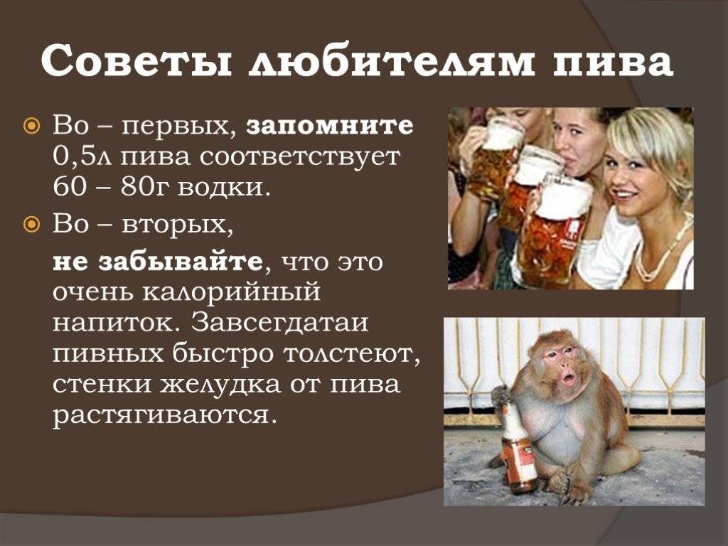 Подросткам не верится, что пиво может довести до настоящего алкоголизма, ведь алкоголя там очень мало, считают они. Но пиво содержит изрядную дозу алкоголя, достаточную как для развития алкоголизма, так и для токсического воздействия на организм — в первую очередь от этого страдают сердце, печень и мозг.