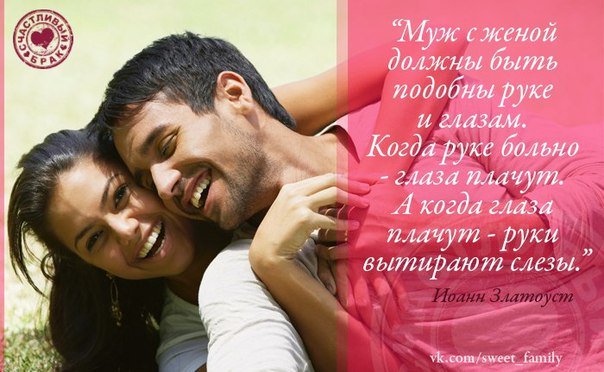 О взаимоотношениях мужа и жены в браке святой апостол Павел сказал великие слова: «Жены, повинуйтесь своим мужьям, как Господу, потому что муж есть глава жены, как и Христос глава Церкви, и Он же Спаситель тела. Но как Церковь повинуется Христу, так и жены своим мужьям во всем. Мужья, любите своих жен, как и Христос возлюбил Церковь и предал Себя за нее… Так должны мужья любить своих жен, как свои тела: любящий свою жену любит самого себя. Ибо никто никогда не имел ненависти к своей плоти, но питает и греет ее, как и Господь Церковь, потому что мы члены тела Его, от плоти Его и от костей Его. Посему оставит человек отца своего и мать и прилепится к жене своей, и будут двое одна плоть. Тайна сия велика; я говорю по отношению ко Христу и к Церкви. Так каждый из вас да любит свою жену, как самого себя; а жена да боится своего мужа» (Еф. 5, 22–25, 28–33).
