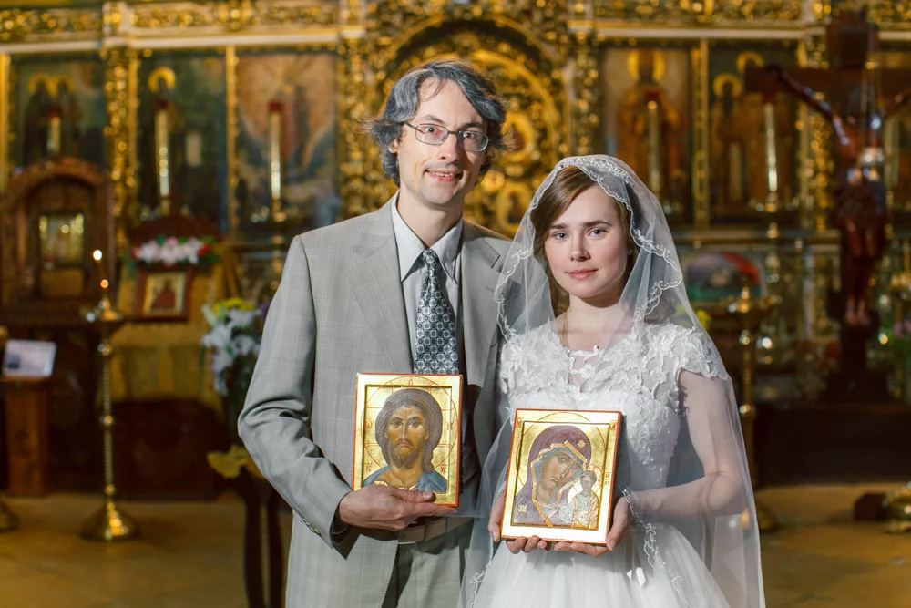 Молодые стремятся сохранить на пленке самый торжественный и трогательный момент их совместной жизни, когда они в окружении ликов святых поклялись принадлежать друг другу до самой смерти.