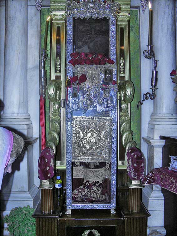 Его останки после нашествия арабов перенесли сначала в Константинополь, а оттуда — в греческий Эпир и потом на Керкиру (греческое название Корфу). Здесь они и покоятся до сих пор. Правда, правая рука святого оказалась в Риме, грекам ее вернули только в 1984 году. Именно ее и привезли в Россию.