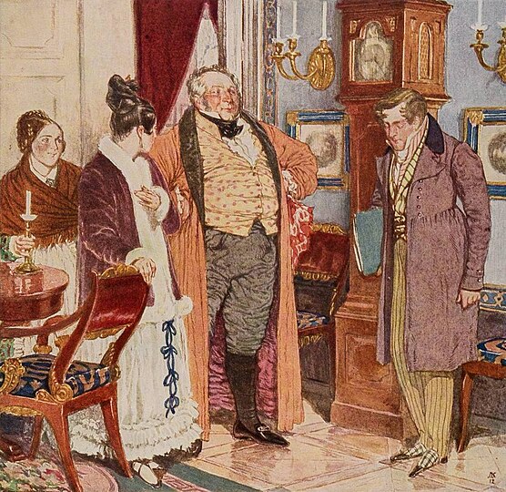Из спальни вышли София с Молчалиным и столкнулись с вернувшимся Фамусовым.