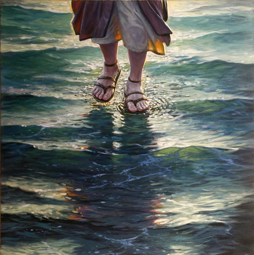 Давайте остановимся здесь на минуту. Эта история рассказана в книгах Марка и Иоанна, а также у Матфея. Иоанн говорит нам, что к этому времени лодка была уже более чем в трех милях от берега (Иоанна 6:19). Марк говорит нам, что Иисус мог видеть учеников с того места, где Он сидел и молился на склоне горы (Марка 6:48). Ученикам было трудно грести, потому что против них дул сильный ветер. Поскольку ученики сели в лодку, у Иисуса был только один способ пересечь озеро. Иисус действительно вышел к ним по воде! Вот еще один пример того, как Иисус имел власть над природой. Каким-то образом вода удержала Его.