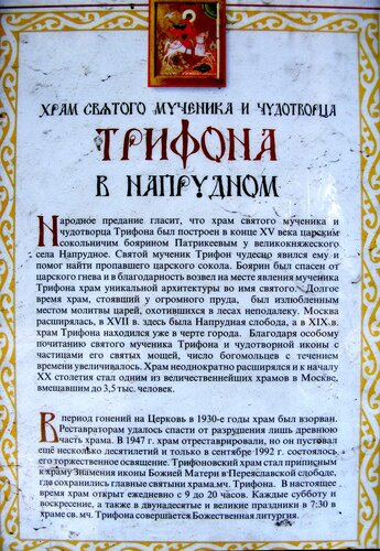 Проснувшись, сокольничий тотчас отправился на это место и, к своей великой радости, нашел там сокола, который спас ему голову, сообщил об этом чуде и тем самым прострелил этому святому широкую дорогу на землю Русскую.Однако следует сказать, что поскольку Патрикеев усердно молился Трифону и носил его имя, значит, этот святой уже тогда был довольно популярен на Руси. В благодарность за его спасение, а главное, за то, что государя не утратило благосклонности, Трифон Патрикеев публично пообещал построить храм во имя этого святого, спасшего ему жизнь, что он и сделал довольно скоро.