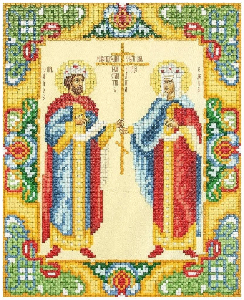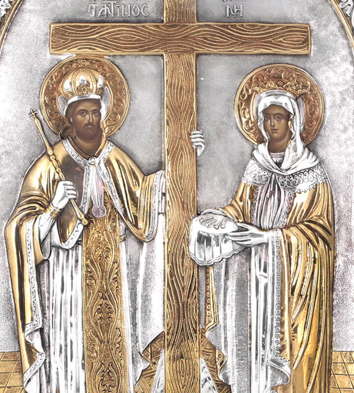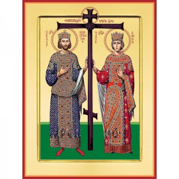 Рукописная икона Константина и Елены. На золотом фоне иконы, словно в свете Божественного сияния, нашему взору открываются величественные фигуры святых равноапостольных Константина и Елены. Святые держат Животворящий Крест Господень. Константин одет в багряный хитон, Елена в алую тунику. Главы их венчают короны. Багряно-красные цвета одежд, их богатое украшение, царственные венцы, показывают нам высокое достоинство святых помазанников Божиих. Колористическое решение иконы подчиняется общей гармонии образа, удачно построенного на контрасте алого и золотого цвета.