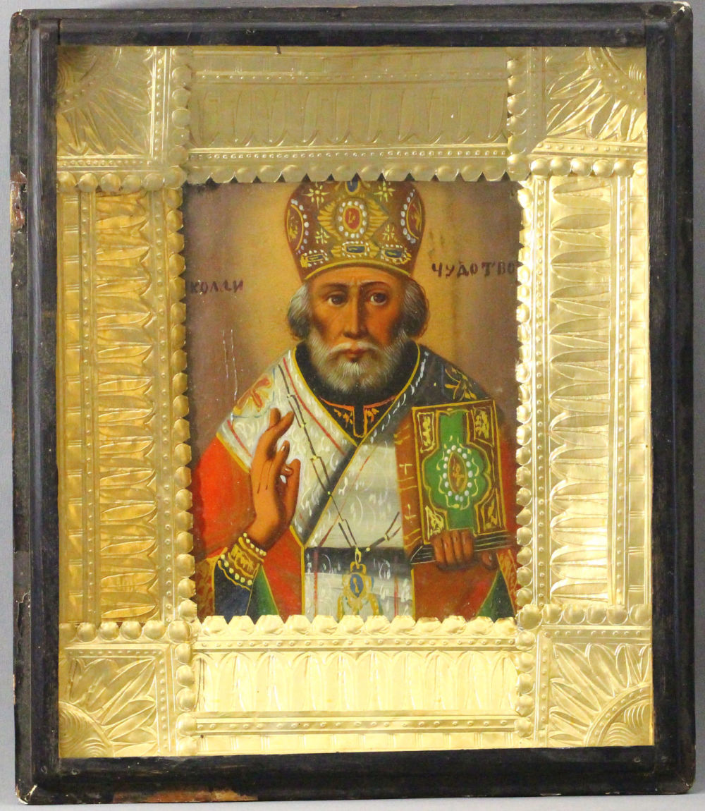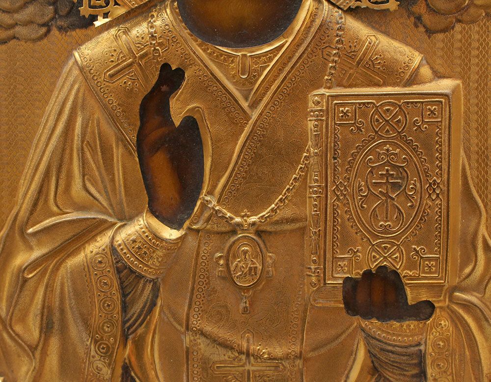 Старинная икона «Святой Николай Чудотворец», Россия, конец 19 века, дерево, живопись, оклад: латунь, штамп.