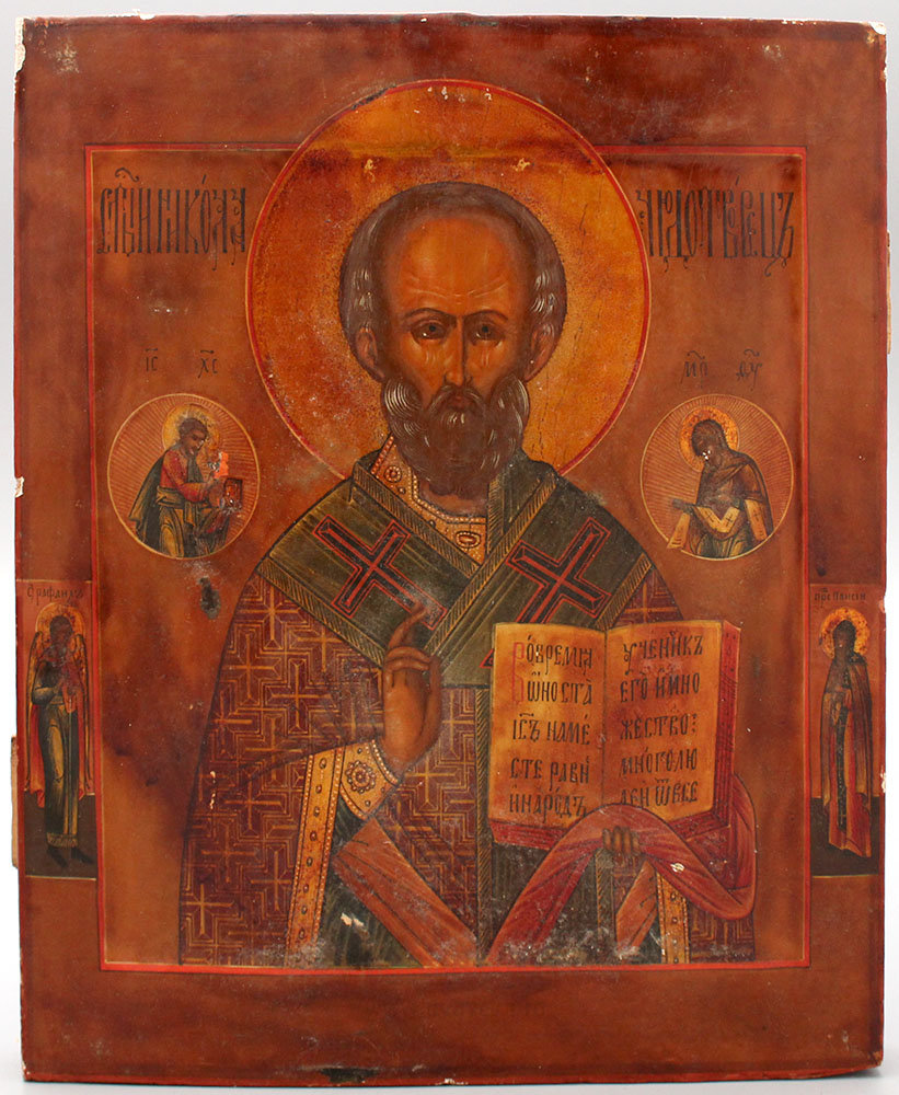 С XIII в. существуют изводы Николая Чудотворца с открытой книгой в руках, на страницах которой помещен текст службы святителю. В Древней Руси такие иконы встречаются довольно редко. В Новое время XVIII–XIX вв. они были распространены преимущественно у старообрядцев, которые изображали Николая Угодника с раскрытым Евангелием и благословляющим двуперстием. Вверху иконы в сферах располагаются Иисус Христос с Евангелием и Богоматерь с омофором. Включение образов Спасителя и Пресвятой Богородицы известно с конца ХIII в., помещение их в круглые медальоны – с ХV–XVI вв., в небесных сегментах – с XVII в. Образы Спасителя и Богородицы рядом с Николаем Чудотворцем напоминают о I Вселенском Соборе (325 г.), на котором произошло так называемое Никейское чудо: святитель Николай обличил еретика Ария, за что был лишен сана и посажен в башню, но вскоре, по воле Господа и Божией Матери, освобожден и восстановлен в епископстве – Христос и Богоматерь вернули ему Евангелие и омофор (знаки святительского сана).![]()