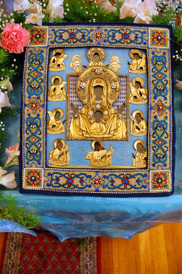 — Нынешняя швейная риза была приготовлена в Иерусалиме русскими сестрами-монахинями, которые молятся на Святой Земле. Но недавно нам пришла новая швейная риза — из Курска, и, возможно, наш первоиерарх вскоре благословит облачить икону в новую «одежду».