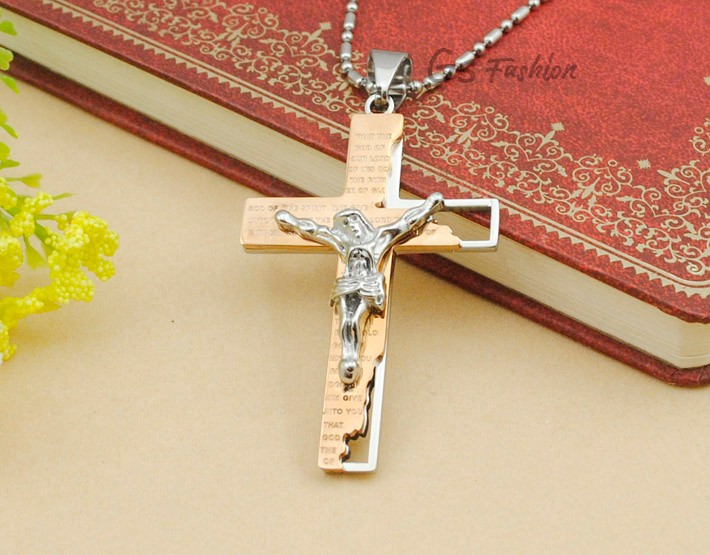 На католическом нательном кресте Иисус показан страдающим: с ранами и струящейся кровью, в терновом венце, с поникшей головой и закрытыми глазами. Его ладони – сжаты в кулак, а ноги скрещены и пригвождены. Так он должен напоминать христианам о том, какую цену заплатил за спасение людей.