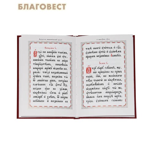 | Богородичен: Радуйся, Дщи Адама тленнаго. / Радуйся, едина Богоневесто. / Радуйся, еюже тля изгнана бысть, яже Бога рождши: / Егоже моли, Чистая, спастися всем нам. | Богородичен: Радуйся, дочь Адама погибшего! / Радуйся, единая Божия Невеста! / Радуйся, ибо тление изгнано / ради Тебя, Бога зачавшая; / Его моли, Чистая, / о спасении всех нас.![]() | |