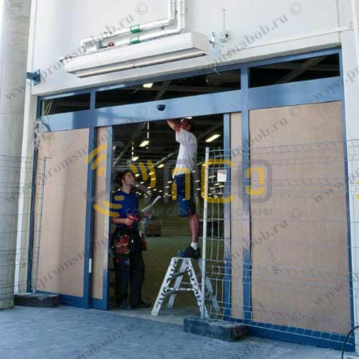 - Большие и сверхмощные устройства предназначены для промышленных объектов с высотой проемов более 700 см. Их устанавливают на проемы складских ворот или ангаров, на входных группах супермаркетов и ТРЦ.