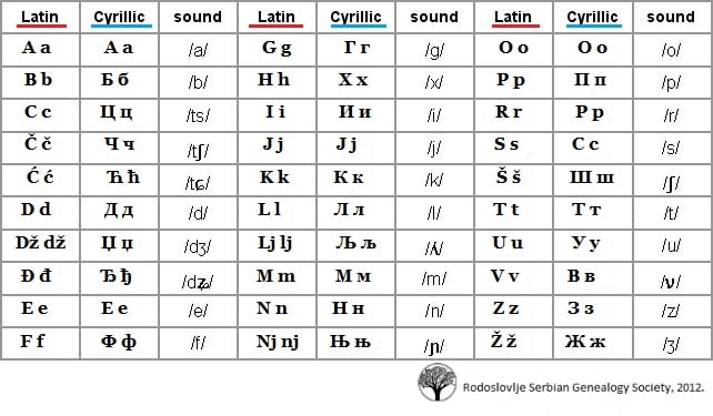 В нашем языке 30 звуков, обозначаемых буквой в обоих алфавитах. Итак, в обоих алфавитах 30 букв соответствуют 30 звукам. Кириллица называется азбука , а латиница – это абеседа . Это означает, что вы можете написать каждое слово на сербском двумя разными способами.