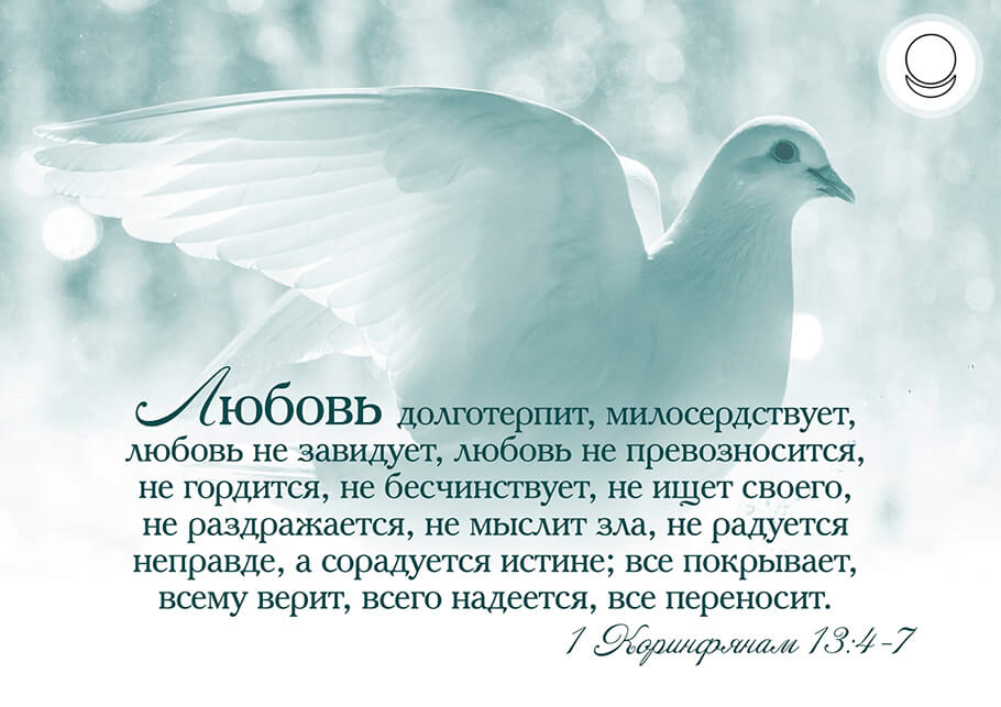 «Любовь долготерпит, милосердствует, любовь не завидует, любовь не превозносится, не гордится, не бесчинствует, не ищет своего, не раздражается, не мыслит зла, не радуется неправде, а сорадуется истине; все покрывает, всему верит, всего надеется, все переносит.» 1. Кор. 13:4-8