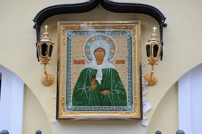 Святая Матрона родилась в 1881 году четвертой из четырех детей в бедной семье в Тульской губернии, Россия. Хотя она родилась слепой, к тому времени, когда ей исполнилось восемь лет, она уже проявила дары пророчества и исцеления. После 1917 русской революции она переехала в Москву, где вела беспризорную жизнь, укрываясь у друзей и родственников в любой квартире или подвале, в которой они жили. Хотя Матрона продолжала проповедовать Православие в враждебную ему коммунистическую эпоху, когда-либо сдал ее властям. Вместо этого они обратились к ней за советом. После ее смерти в 1952 году ее могила стала местом паломничества, которым она остается и по сей день, хотя ее мощи сейчас перенесены в часовню Покровского монастыря в Москве.