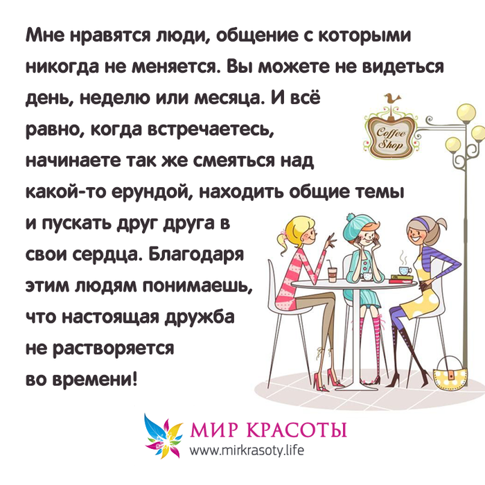 Мне нравятся люди, общение с которыми никогда не меняется. Вы можете не видеться день, неделю или месяца. И все равно, когда встречаетесь, начинаете так же смеяться над какой-то ерундой, находить общие темы и думать по-прежнему одинаково. Благодаря этим людям понимаешь, что настоящая дружба не растворяется во времени.