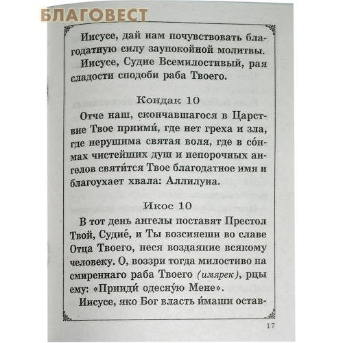 «Боже, Господь милосердный, вспоминая годовщину смерти раба Твоего N (рабы Твоей N) просим Тебя, удостой его (её) места в Царствии Твоём, даруй благословенный покой и введи в сияние славы Твоей.