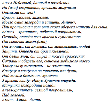 «Ангел Божий, Хранитель мой с рождения и до самой кончины, молю Тебя, заступник, сохрани меня от всякого зла. Погаси в душе негатив, мной управляющий да жизнь мою праведную нарушающий. Направь меня, раба Божьего (имя), на путь исправления да избавь меня от врагов и недоброжелателей, моих неприятностей алчущих. Аминь».