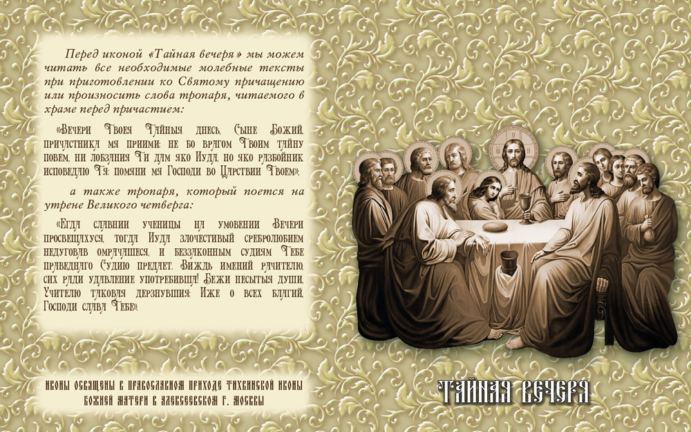 Спаситель мой, Христе Боже! Удостой меня, потерявшего всякую надежду на спасение, быть ныне причастником небесных, страшных и святых тайн и Твоей Божественной таинственной вечери.