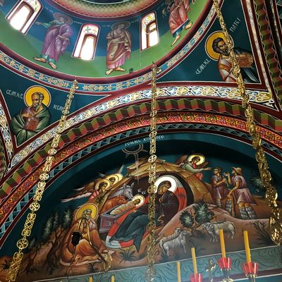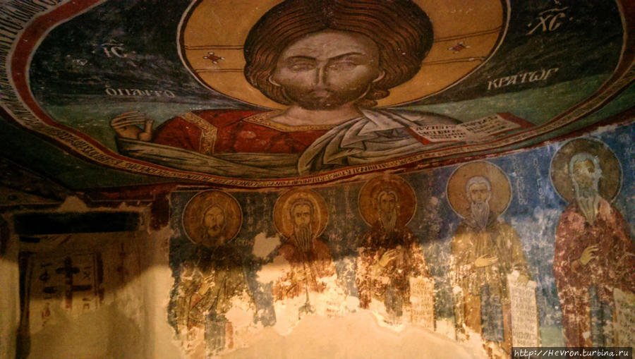 Стены церкви расписаны фресками. Их живописец, отец Филарет, был учеником иконописной школы монастыря Святого Ираклидия. На одной из фресок изображен святой Минас, на другой — святой Георгий, а на третьей, которая называется «Грань смирения», — изображен распятый Спаситель, Его страсти и Его гробница, где вместо лежащего Христа кажется, висит на Святом Кресте.