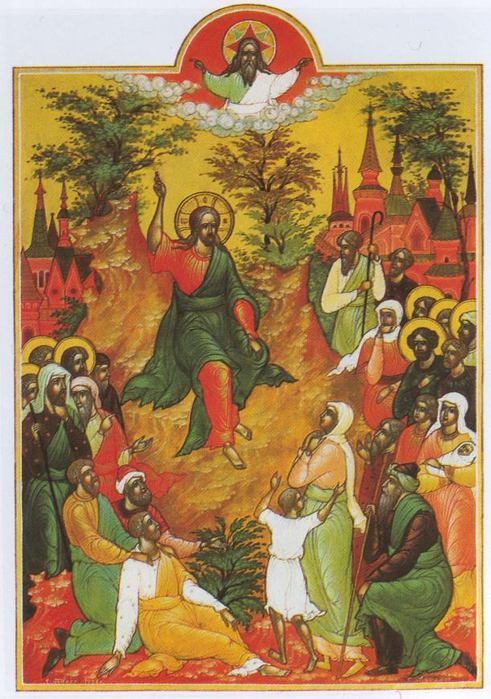 Иисус, увидев народ, взошел на гору и сел. К нему пришли его ученики,