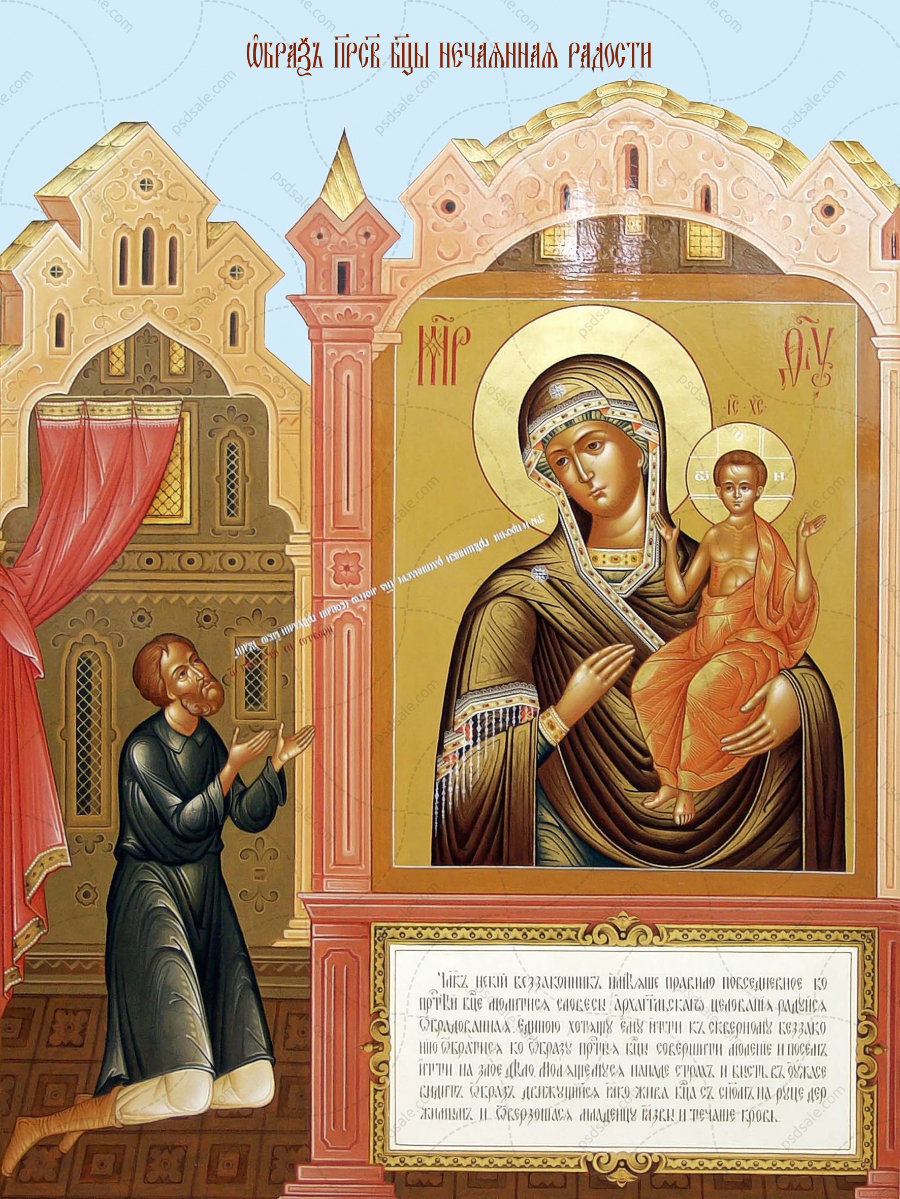 Икона «Нечаянная радость» («Божьей радости», «Неожиданная радость», «Нежданная радость», «Случайная радость» – ее по-разному величают в народе) – это визуальное отражение рассказа Митрополита Ростовского Димитрия, впоследствии канонизированного.