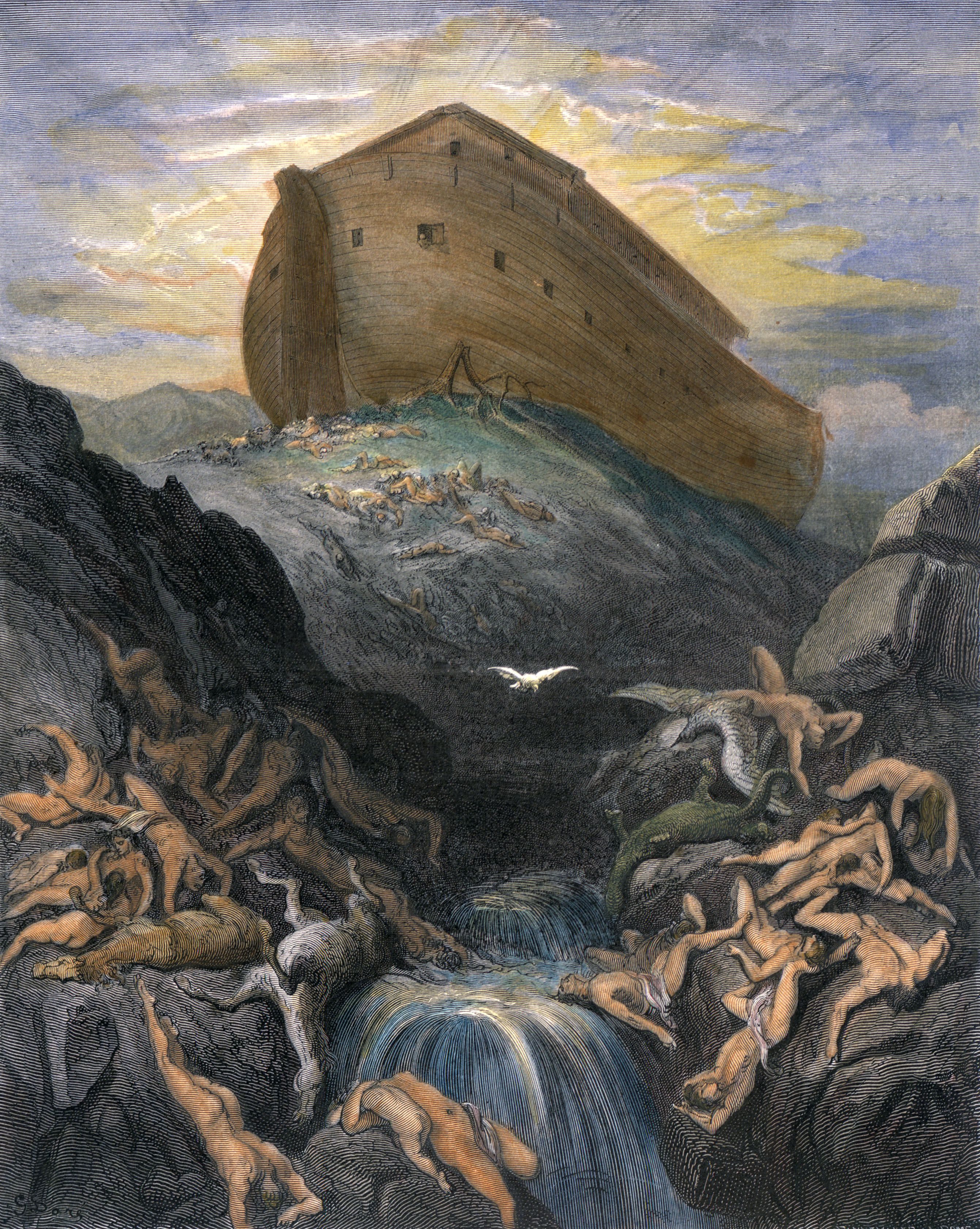 В иудео-христианской истории о потопе Бог разгневался на грехи человечества. Он велел своему верному слуге Ною построить ковчег, достаточно большой для его семьи (в которую входили восемь человек: его жена, трое его сыновей и их жены) и по паре всех созданий на земле. Бог наслал обещанный потоп, убив всех и вся на земле, кроме населения ковчега.