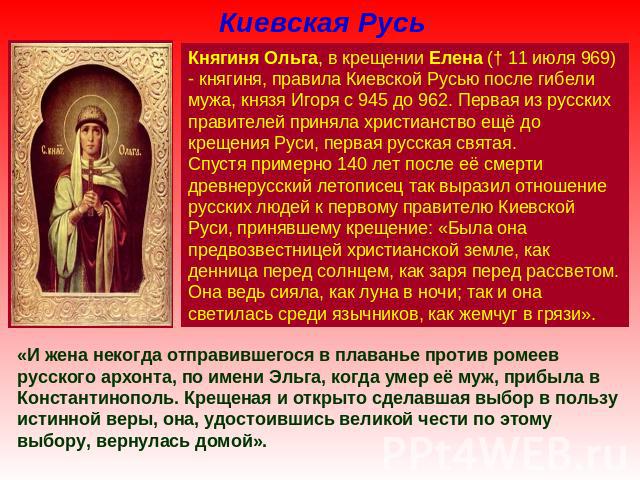 Около 913 года[2] – 11 (23) июля 969 года Великая княгиня Киевской Руси (945–969)Одна из основоположниц русской