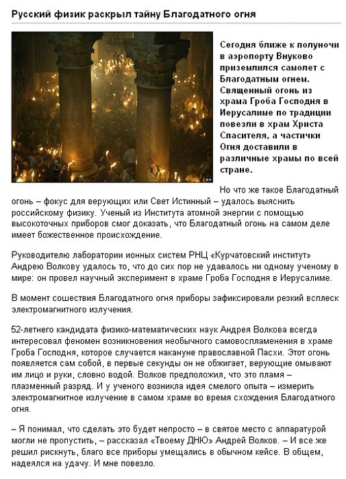 — Говорят, что этот огонь не жжется. Те, кто были в Иерусалиме говорят: жжется, еще как. Просто когда быстро проносишь – не жжется. Хватит эти слухи распространять. Я тоже могу сказать, что он жжется. Народу нравится, что такое чудо происходит. Вот и поддерживается один за другим ложный слух.