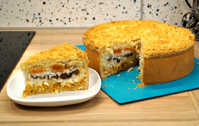 По вкусу напоминает пирог с мясом, наверно, из-за сырого лука, который томится с картофелем в начинке. Мы съели его с рекордной скоростью, чего не могу сказать о сладких пирогах и тортах.