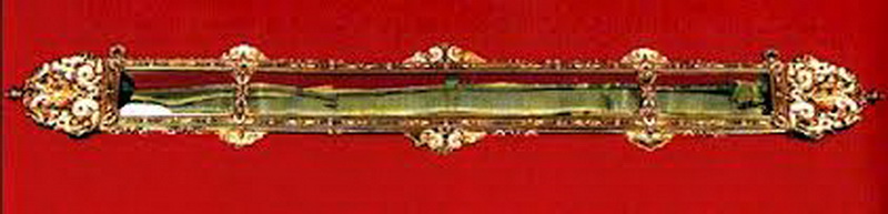 Тонкий пояс из верблюжьей шерсти и золотых нитей длиной около 60 сантиметров. По преданию, это пояс сплетенный Божией Матерью и данный ею апостолу Фоме.