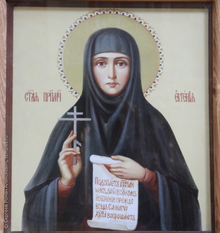 Избранная добродетелей подвижнице, учения Христова проповеднице Евгение, похвальная восписуем ти по достоянию. Ты же, яко имущая дерзновение ко Господу, от всяких бед и напастей свободи и наследниками Царствия Небеснаго соделай нас, да зовем ти: