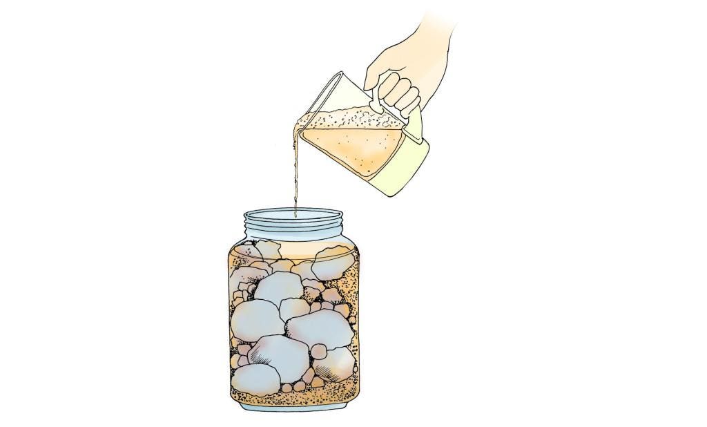 Профессор достал из стола ещё одну коробку. На этот раз в ней был песок. Он аккуратно стал засыпать его в банку. Мелкие песчинки заполнили все оставшиеся просветы и всё закрыли.