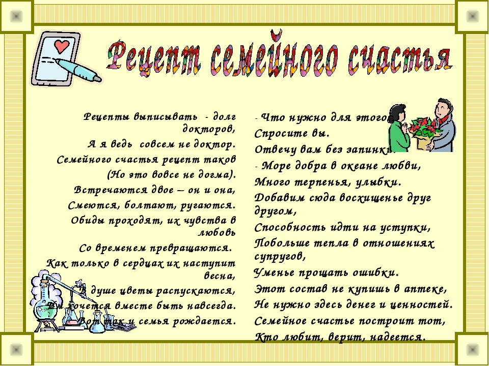 В формуле семейного счастья много слагаемых… Она одновременно и проста и сложна…. Но попытаться найти её решение необходимо — в науке жить она едва ли не самая главная!