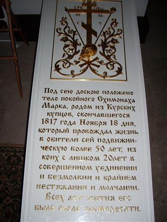 Старец был похоронен в сделанном им самим дубовом гробу-колоде. При открытии гроба обнаружили сохранившийся скелет, истлевшие одеяния, медный крест и другие предметы.
