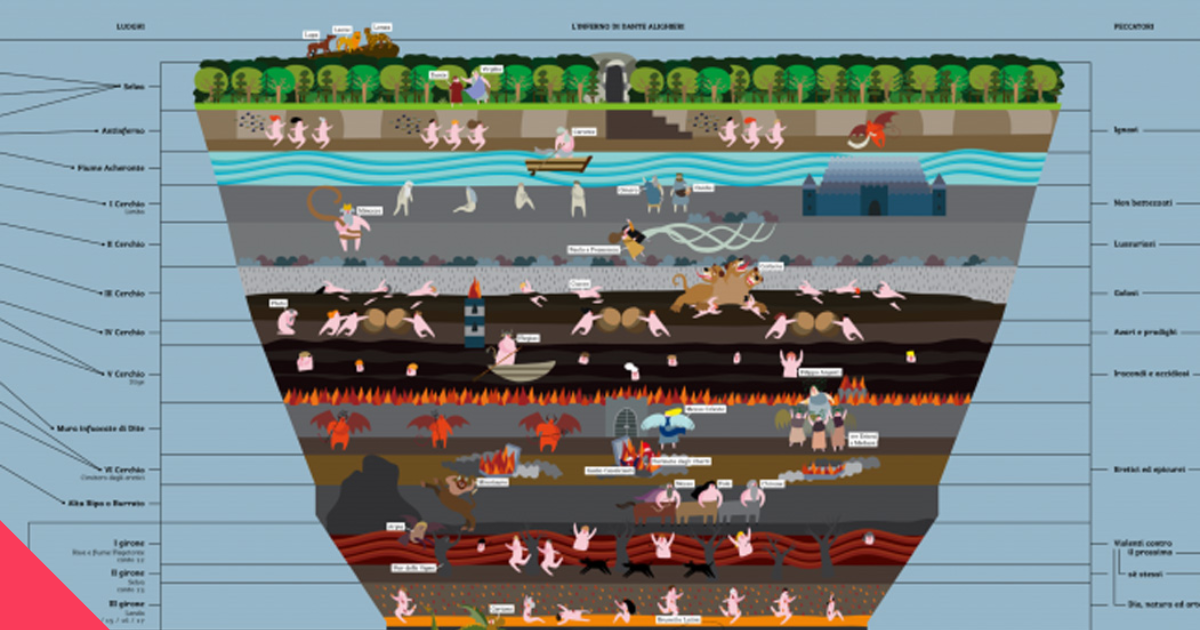 В «Божественной комедии» Данте Алигьери представляет ад, у которого 9 кругов (последние круги ещё делятся на пояса), и чем ниже круг, тем грехи, совершённые при жизни человеком, серьезнее.