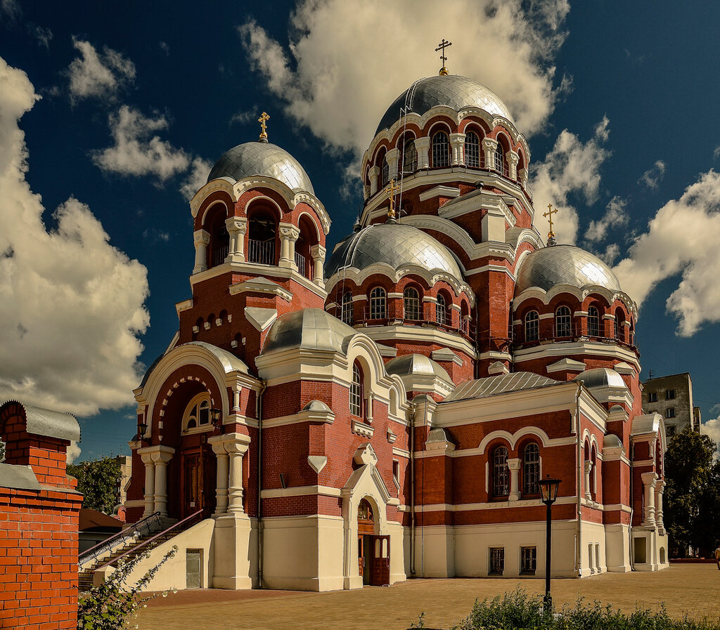 Изначально храм построили в «кирпичном стиле» — узорный темно-красный кирпич церковных стен стал символом возвращения к традициям зодчества допетровской Руси. Соборный храм представлял собой пятиглавое здание с трехъярусной колокольней. Одноглавую церковь венчал деревянный купол, обитый железом. Колокольня включала восемь колоколов разной величины — самый большой из них весил более 800 килограммов.