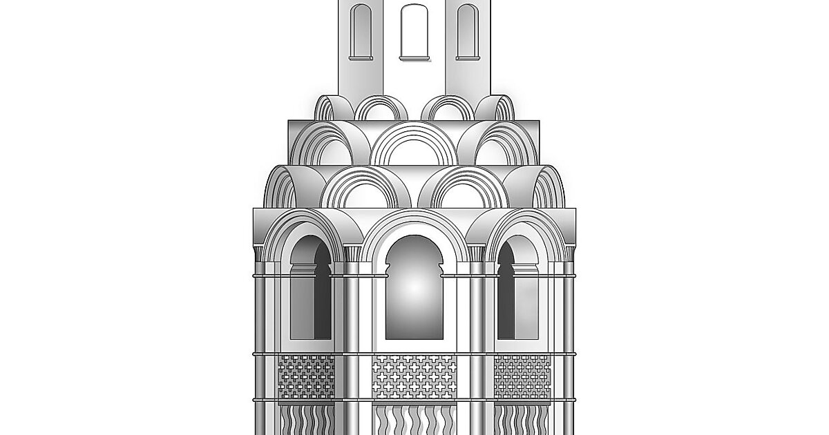 Дверь — это так называемый перспективный портал, подчеркивающий вход в собор. Стены храма со всех сторон имеют трехчастное деление. Один участок такой разделенной на части стены называется прясло. Каждое прясло завершается килевидной закомарой — это полукруглое завершение наружного участка стены.