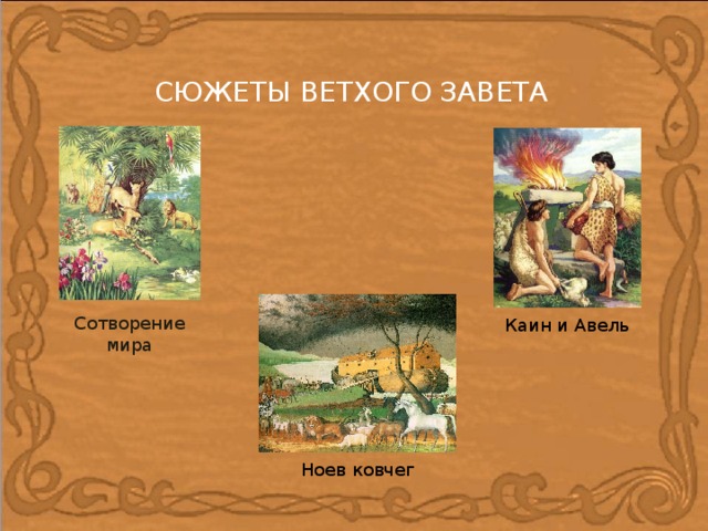Библейские сюжеты послужили основой множества живописных, скульптурных, литературных, музыкальных и драматических произведений разных времен и народов.